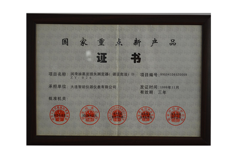 10.?1999年11月,公司研發(fā)的全自動(dòng)潤(rùn)滑油蒸發(fā)損失測(cè)定器獲得國(guó)家科技部,國(guó)家稅務(wù)總局、對(duì)外貿(mào)易經(jīng)濟(jì)合作部、質(zhì)量技術(shù)監(jiān)督局,國(guó)家環(huán)境保護(hù)總局聯(lián)合頒發(fā)的國(guó)家重點(diǎn)新產(chǎn)品證書。